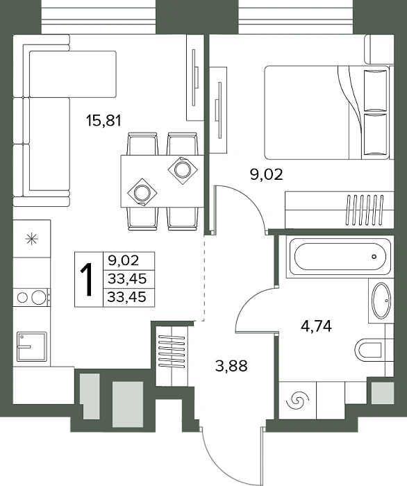 - Общая площадь 33.45 м²