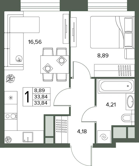 - Общая площадь 33.84 м²