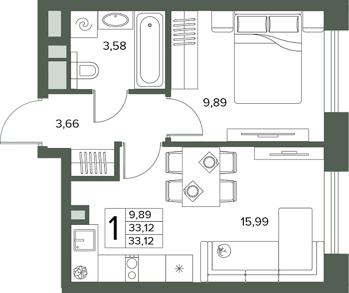 - Общая площадь 33.12 м²