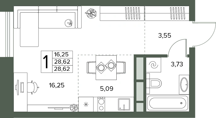 - Общая площадь 28.62 м²