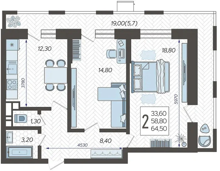 - Общая площадь 64.5 м²