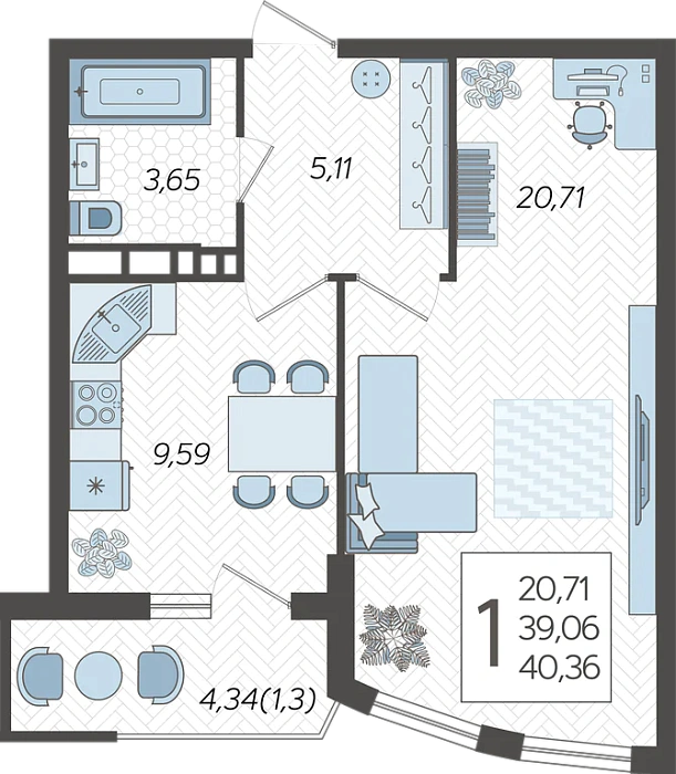 1-комнатная квартира №361, 40.36 м²