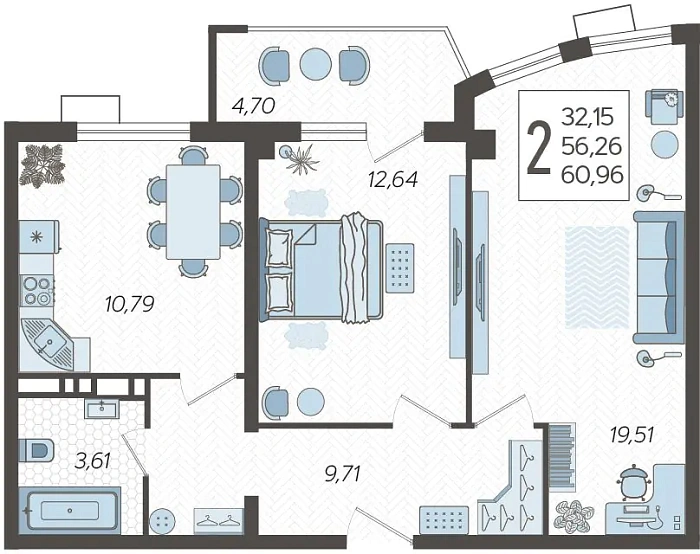 - Общая площадь 60.96 м²