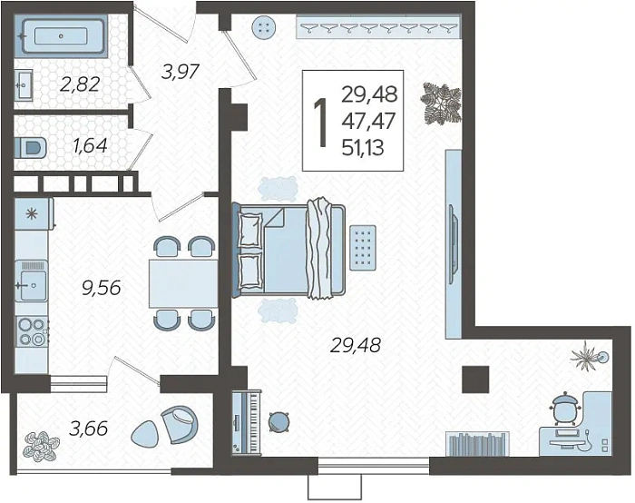 - Общая площадь 51.13 м²