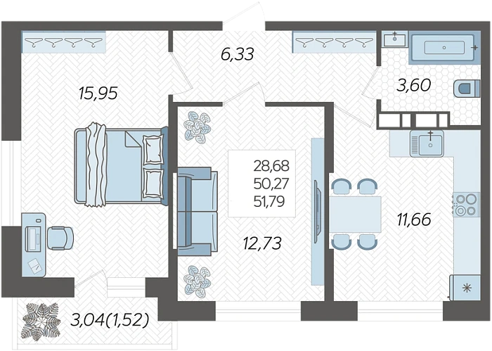 - Общая площадь 51.79 м²