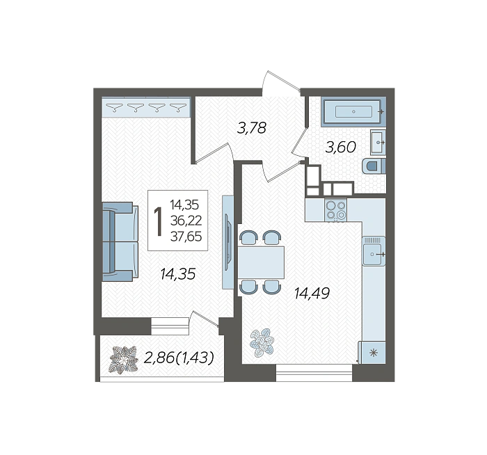 1-комнатная квартира №6, 37.65 м²