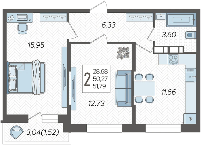 - Общая площадь 51.79 м²