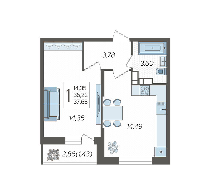 1-комнатная квартира №526, 37.65 м²