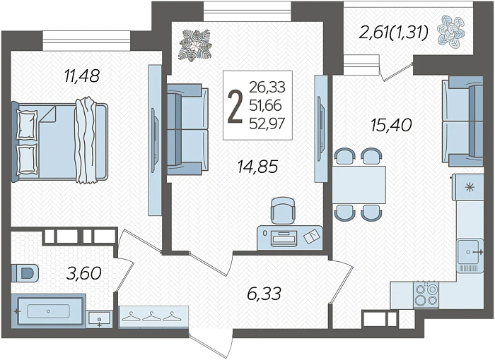 - Общая площадь 52.97 м²