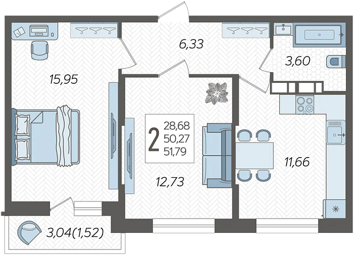 - Общая площадь 51.79 м²