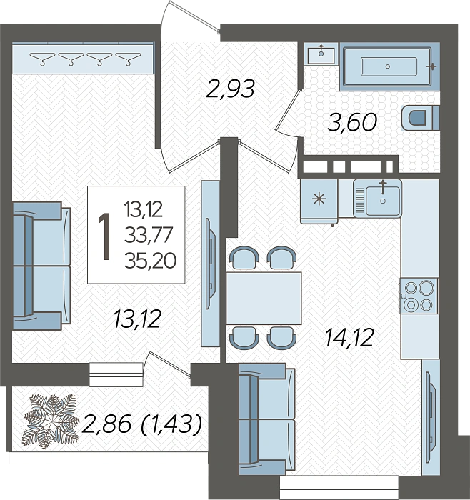 1-комнатная квартира №157, 35.2 м²