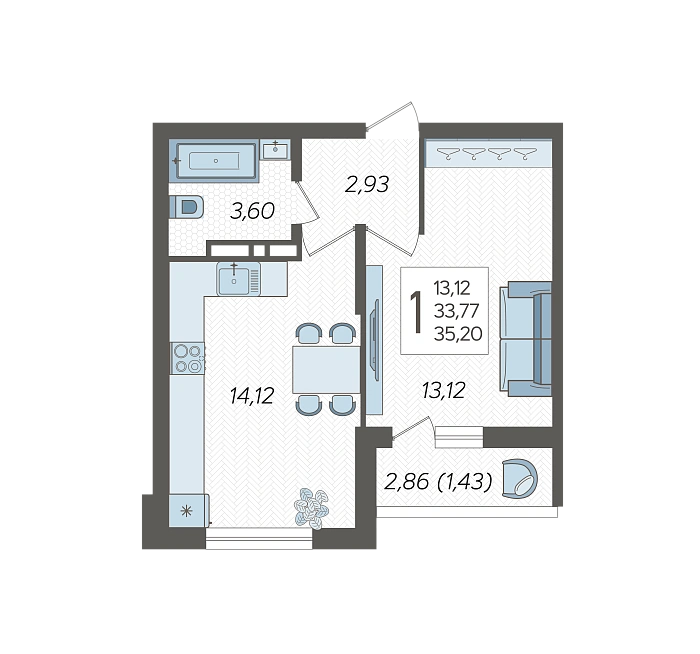 1-комнатная квартира №297, 35.2 м²