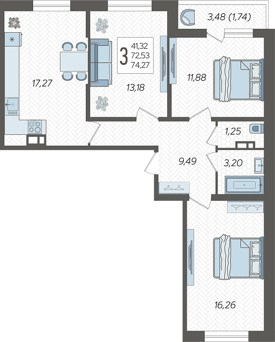 3-комнатная квартира №109, 74.27 м²
