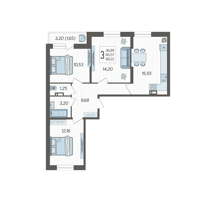 3-комнатная квартира №24, 68.22 м²