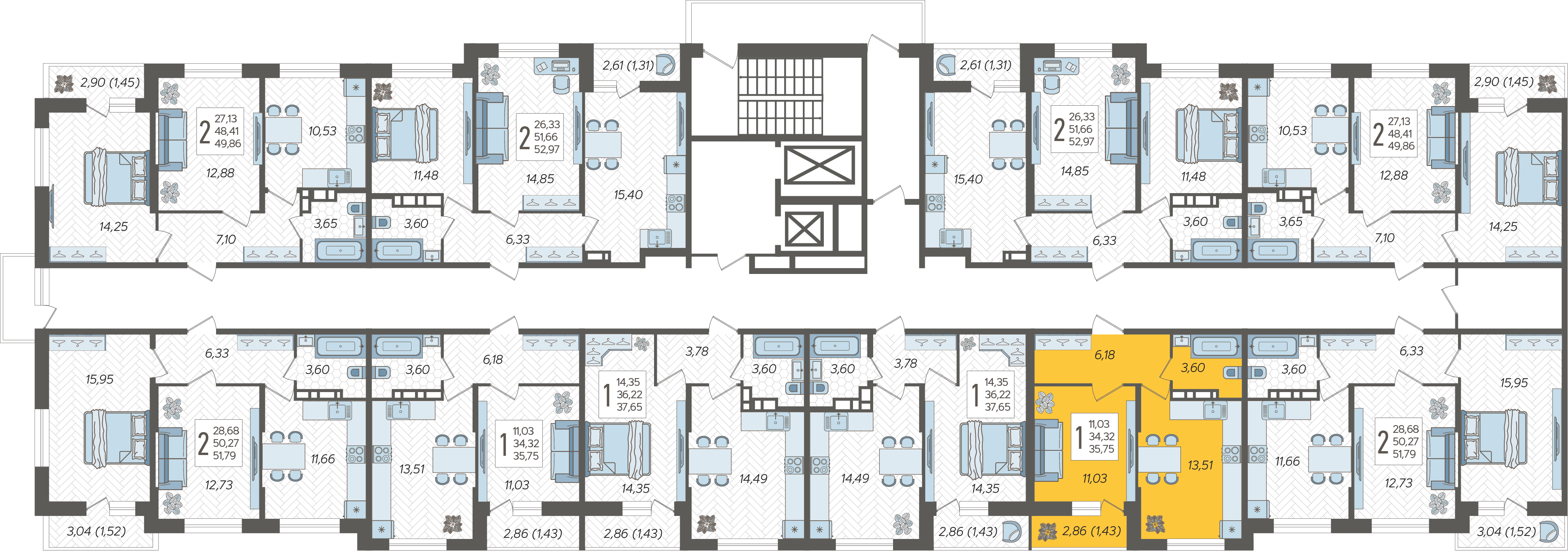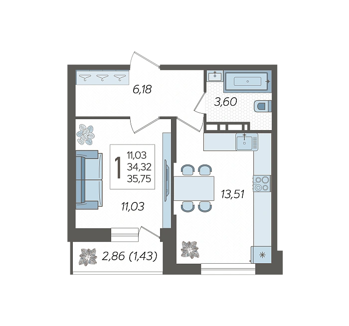 1-комнатная квартира №184, 35.75 м²