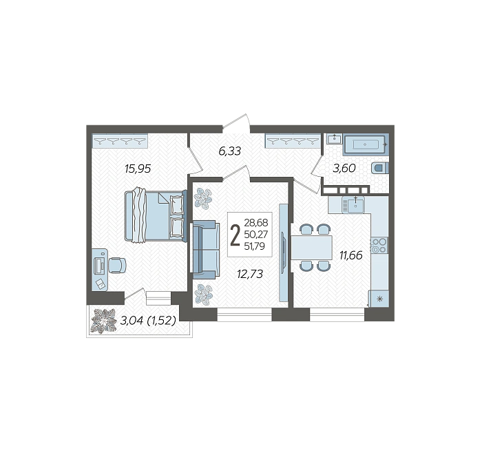 2-комнатная квартира №128, 51.79 м²