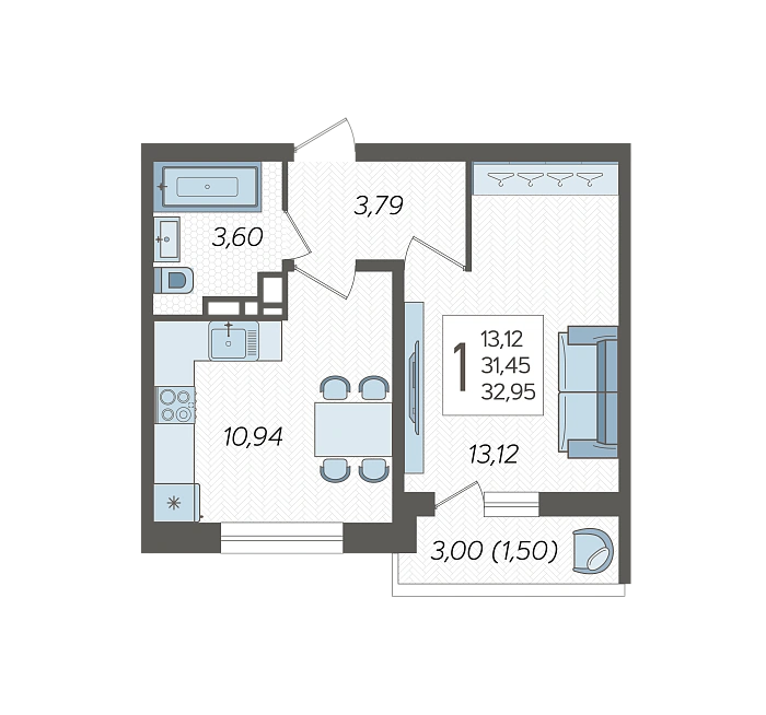 1-комнатная квартира №295, 32.95 м²