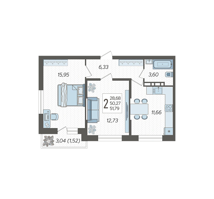 2-комнатная квартира №308, 51.79 м²