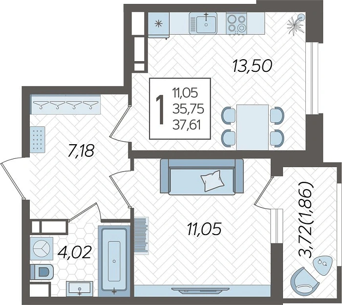 1-комнатная квартира №1199, 37.61 м²