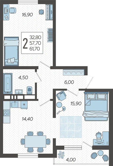 - Общая площадь 61.7 м²