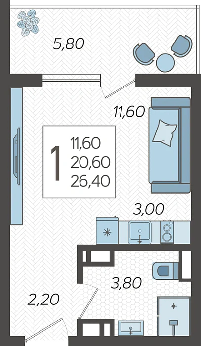 - Общая площадь 26.4 м²