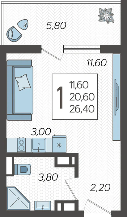 - Общая площадь 26.4 м²