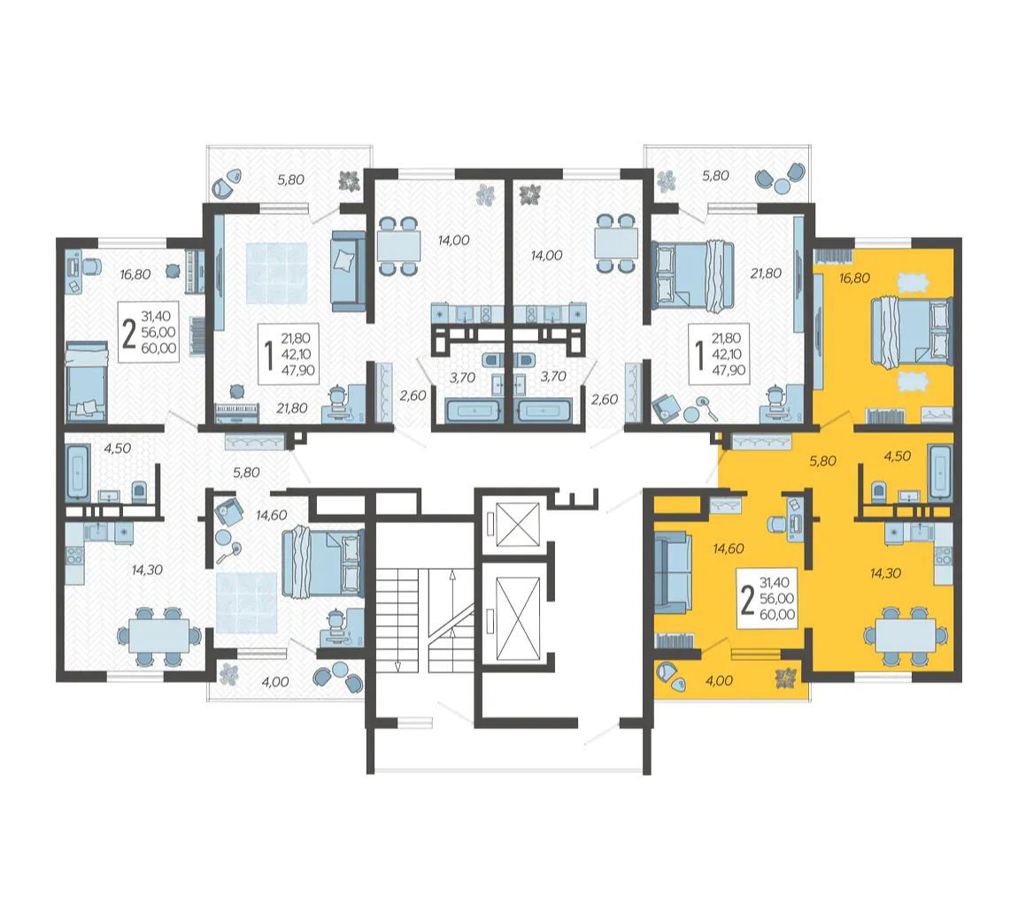 - 2-комнатная квартира №12, 60 м²