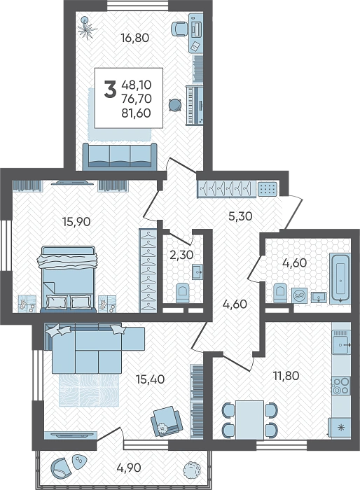 3-комнатная квартира №183, 81.6 м²
