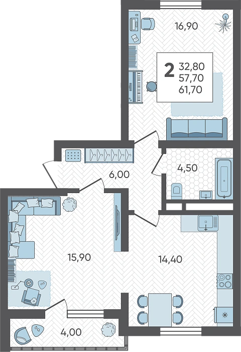 - Общая площадь 61.7 м²