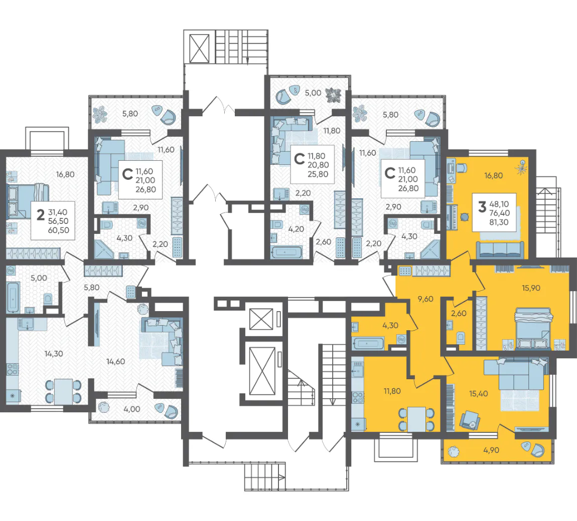 3-комнатная квартира №5, 81.3 м²