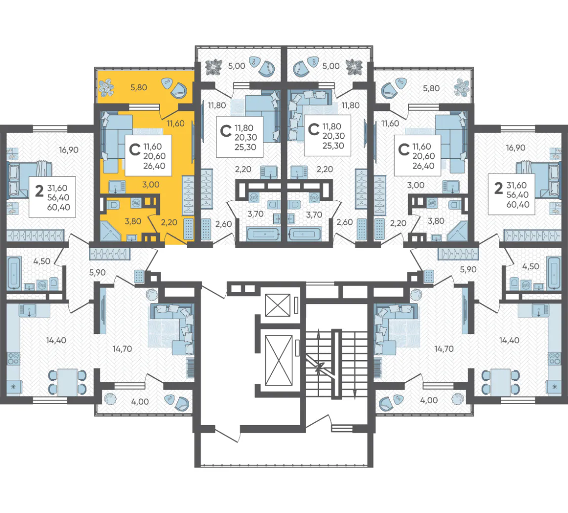 - Общая площадь 26.4 м²