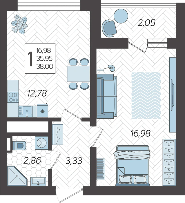 1-комнатная квартира №291, 38.9 м²