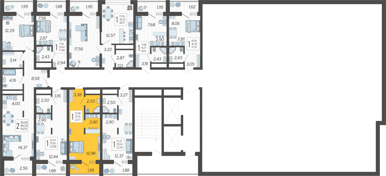 - Жилая площадь 12.98 м²