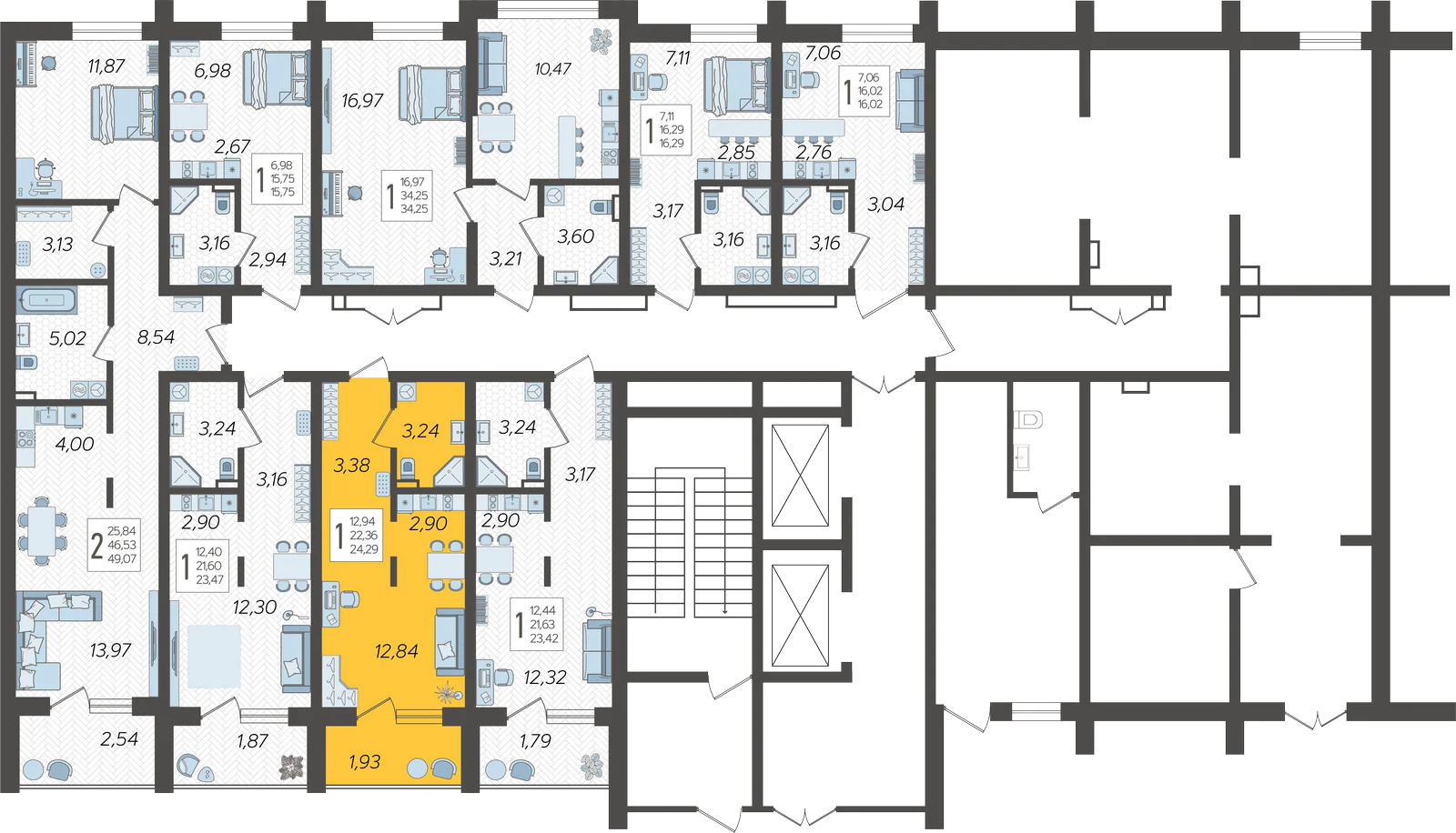 - Жилая площадь 12.84 м²
