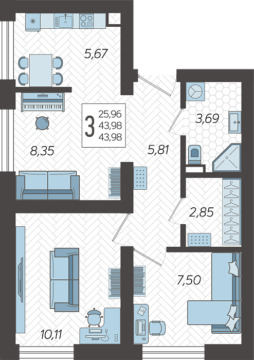 - Общая площадь 43.98 м²