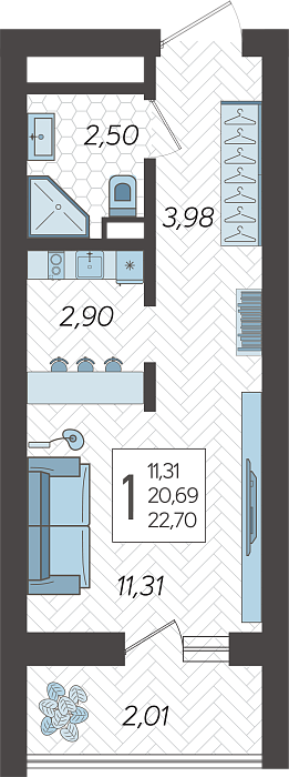 - Общая площадь 22.7 м²