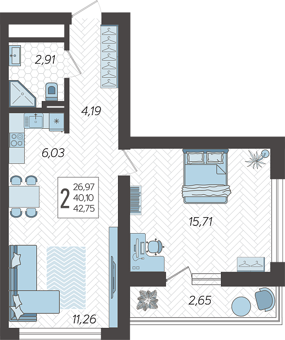 - Общая площадь 42.75 м²