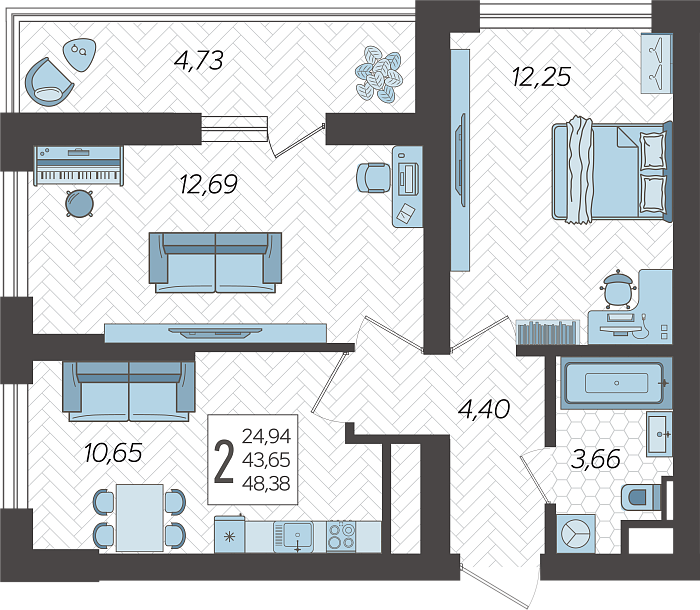 2-комнатная квартира №201, 48.38 м²