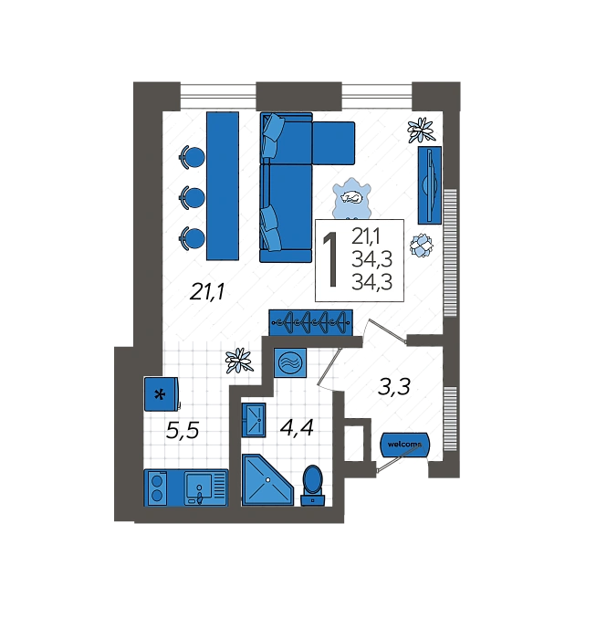 - Общая площадь 34.3 м²