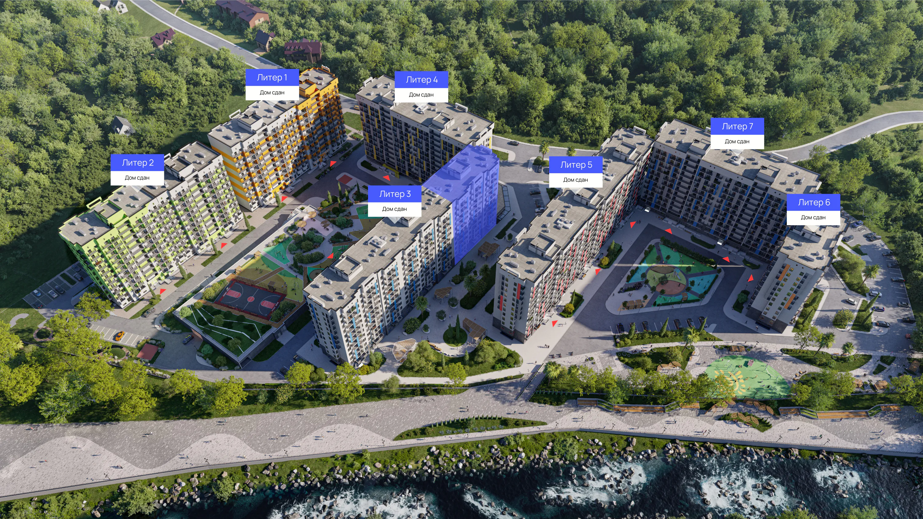ЖК «Летний» - это семь 12-этажных домов, которые находятся в долине реки Кудепста, с собственной набережной, видом из окон на море и горы, многоуровневым паркингом с эксплуатируемой кровлей, современными детскими и спортивными площадками.