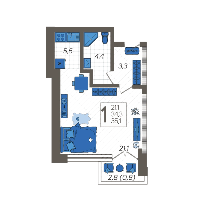 - Жилая площадь 21.1 м²