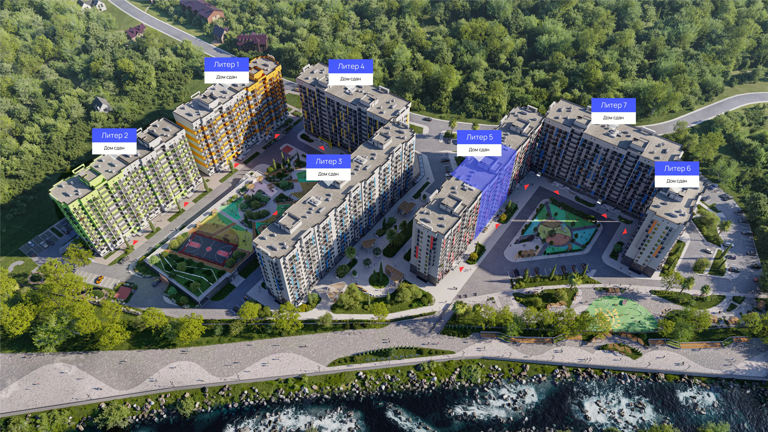 ЖК «Летний» - это семь 12-этажных домов, которые находятся в долине реки Кудепста, с собственной набережной, видом из окон на море и горы, многоуровневым паркингом с эксплуатируемой кровлей, современными детскими и спортивными площадками.