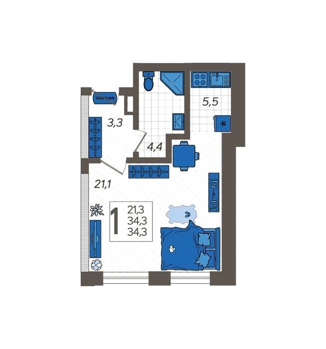 - Общая площадь 34.3 м²