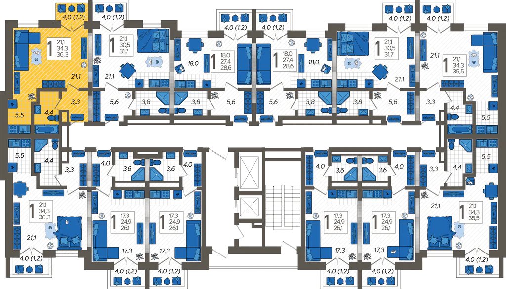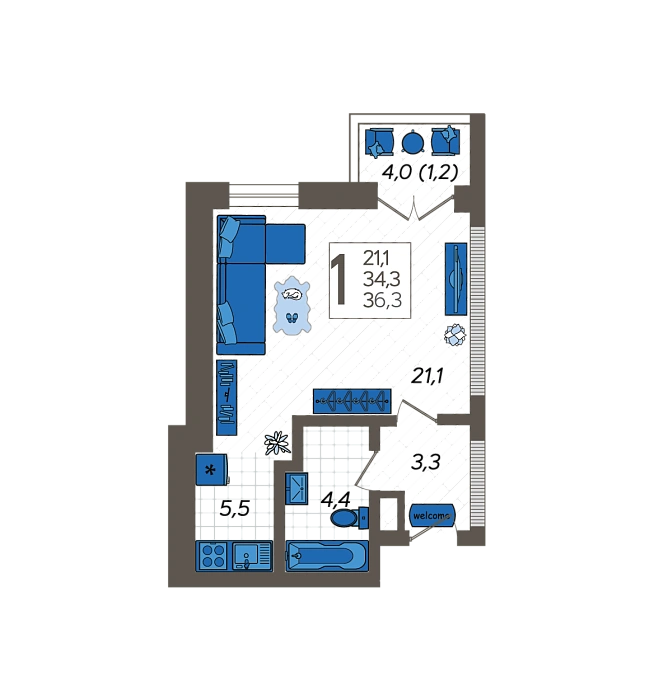 - Жилая площадь 21.1 м²